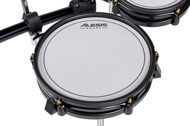 This drum kit is equipped with an 8” kick, a 12” dual-zone snare, two 8” dual-zone rack toms, and a 10” dual-zone floor tom, (Patent #US 9,424,827 B2) along with a 12” hi-hat with control pedal, two 12” crashes with choke, and a 14” triple-zone ride. A premium 4-post steel rack with a separate double-braced snare stand keeps everything solidly anchored, no matter how hard you play.