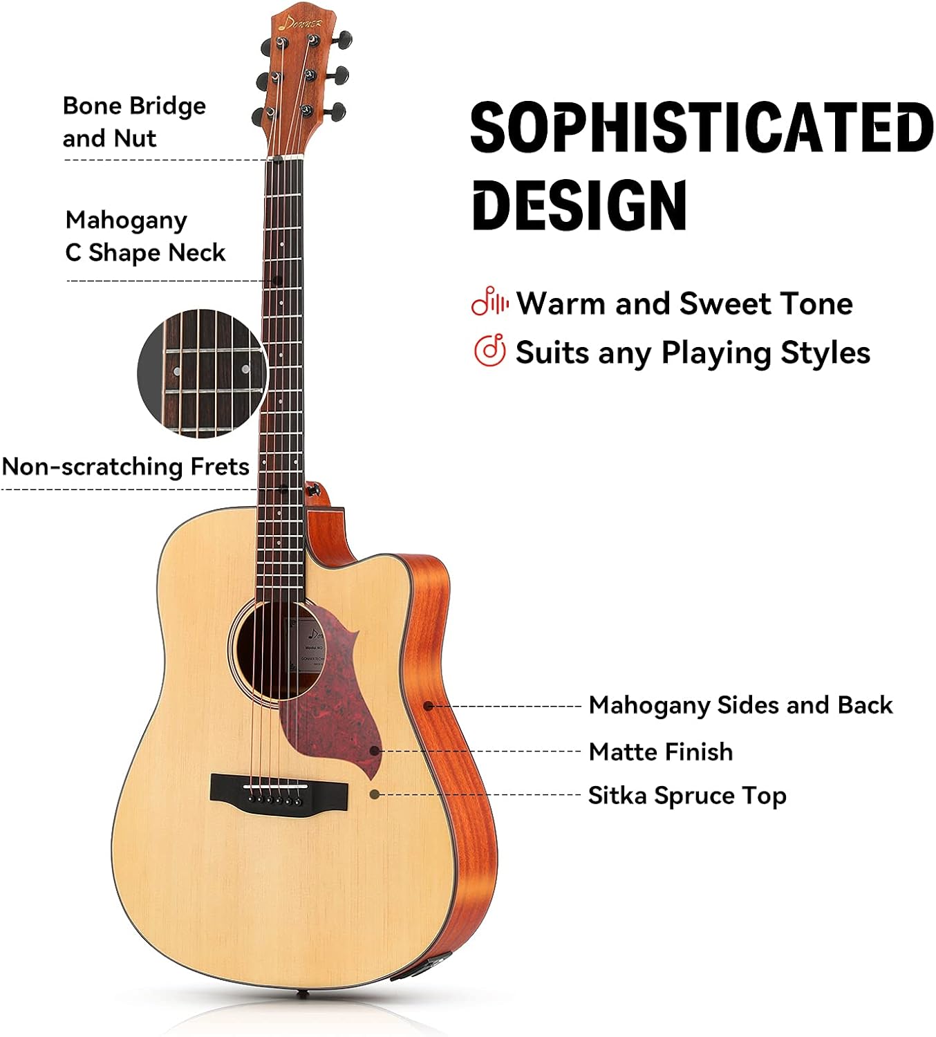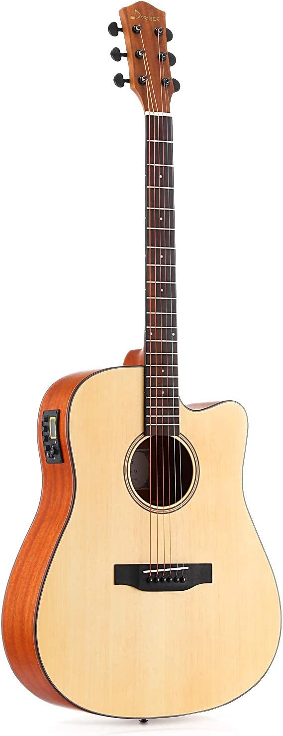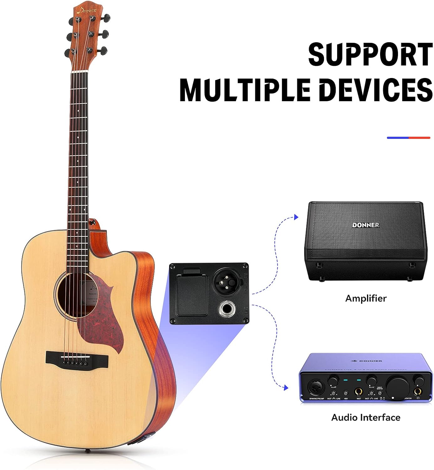 *Gitar Donner dengan bodi dreadnought cutaway 41 inci berukuran penuh, agar menghasilkan nada yang dinamis dan energik, tepat untuk semua gaya musik.