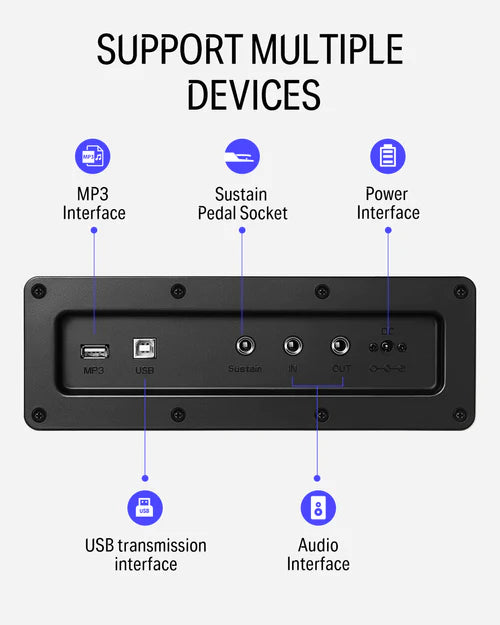 DDP-100 menawarkan konektivitas USB-MIDI. Antarmuka transmisi USB dapat dihubungkan ke komputer, iPad, dan sebagainya. Melalui perangkat lunak musik yang terinstal di komputer, Anda dapat mempelajari atau memainkan keyboard untuk menampilkan, membuat, dan menyimpan musik. Musik yang diedit dan pengiring bawaan dalam perangkat lunak musik dapat dimainkan oleh piano digital yang terhubung ke perangkat lunak atau dengan musik pengiring.
