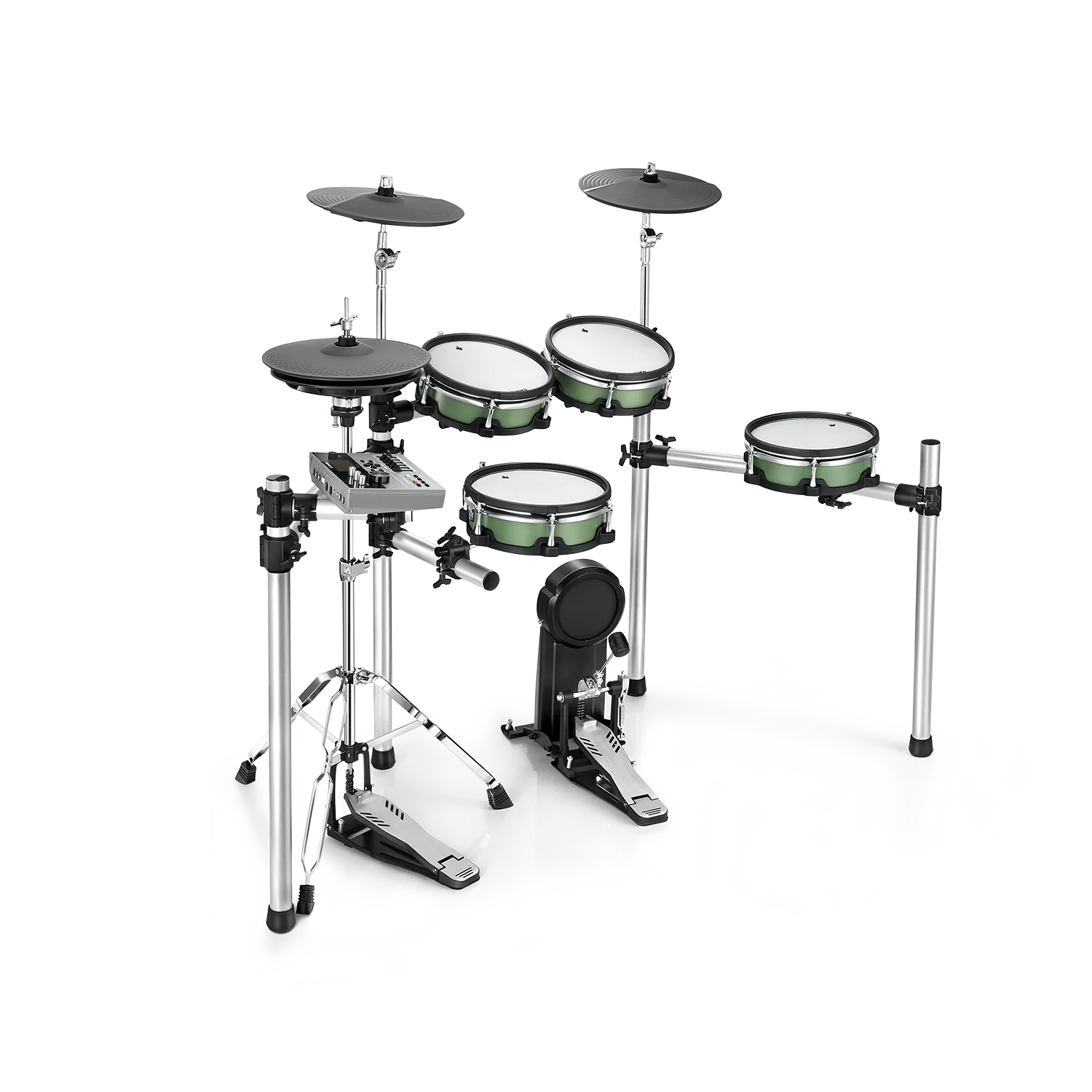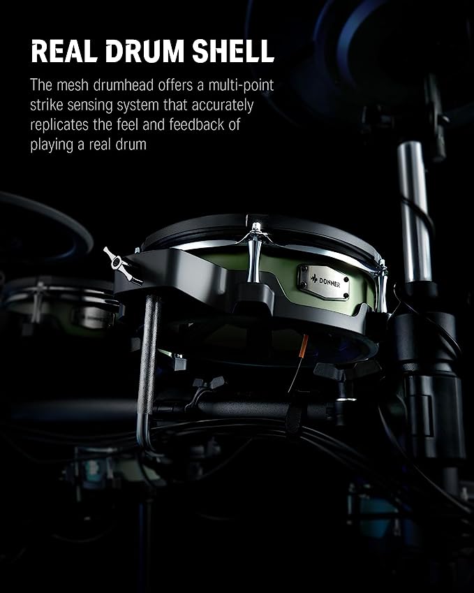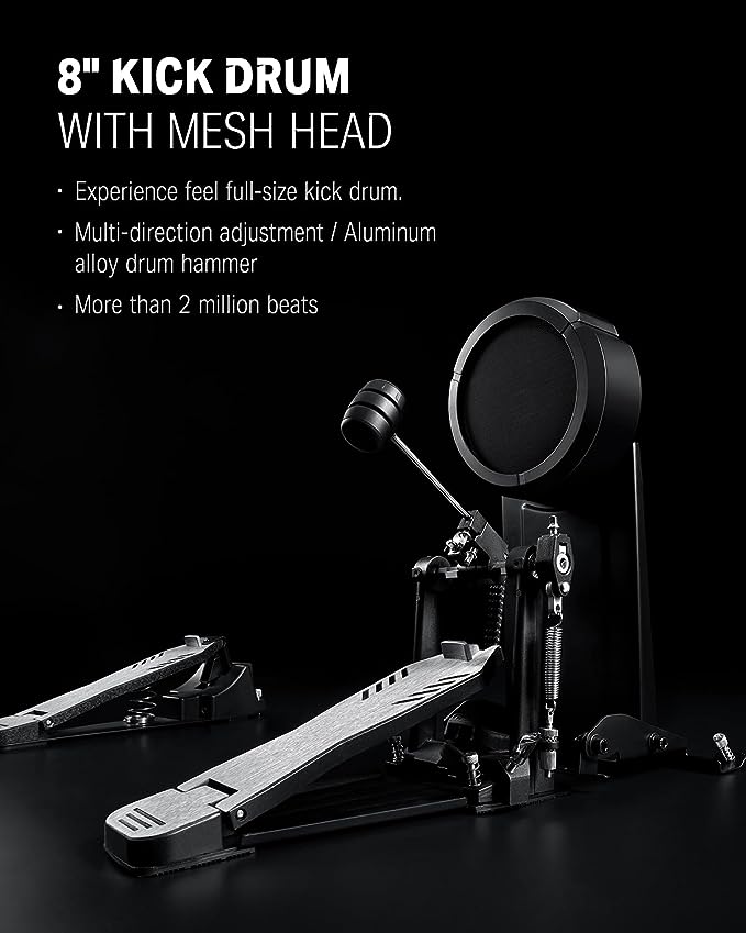 Drumhead Mesh 2 lapis level berikutnya terasa hebat dan pelacakan dinamis yang tepat dengan daya tahan bertahun-tahun. Bass Drum dan pedal memberikan performa yang solid bagi para drummer. HH bergerak bagi yang ingin merasakan simbal Hihat yang menderu-deru.Modul