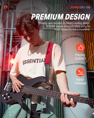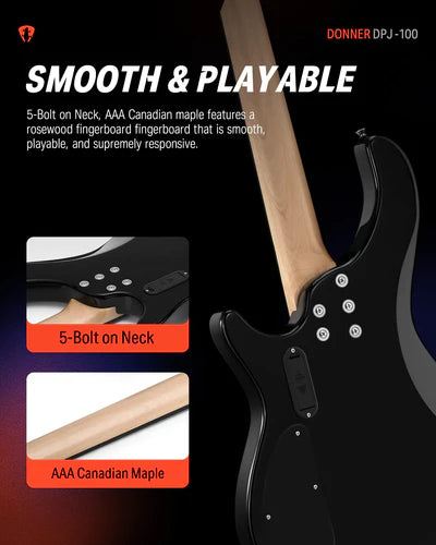 Selain fitur keren lainnya, Donner DPJ-100 Bass menampilkan keanggunan tambahan dari finishing headstock pemotongan khusus yang serasi.