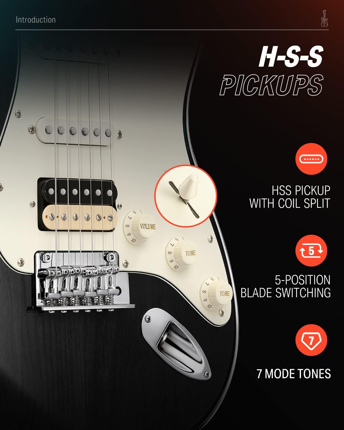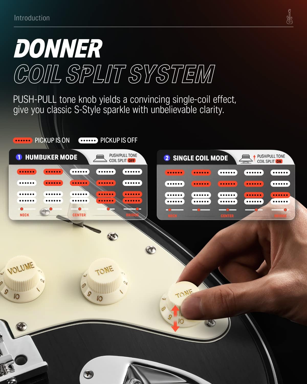 Pickup HSS Donner khusus yang dibuat di Korea memiliki output daya yang lebih besar dan distorsi yang dinamis. Fungsi 5-way switch (7 Mode-Tones) untuk memilih variasi karakter suara yang dihasilkan bagi berbagai genre musik. Kenop kontrol Push-Pull nya berfungsi untuk memisahkan aliran-listrik dari koil, sehingga koil tsb akan menjadi sebuah koil-tunggal (single coil) yang menghasilkan karakter suara gitar-elektrik klasik yang jernih.