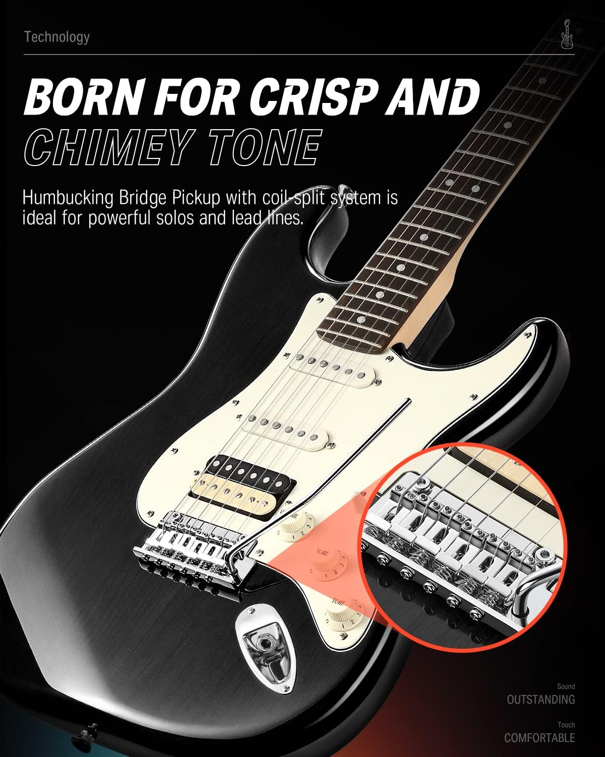Gitar elektrik berbodi padat ini dilengkapi dengan bridge tremolo dua-titik & sadel bergaya vintage untuk stabilitas proses stem & penyesuaiannya. Pop-in arms dapat dikencangkan sesuai tension pilihan anda untuk menghasilkan tremolo-action yang sesuai.