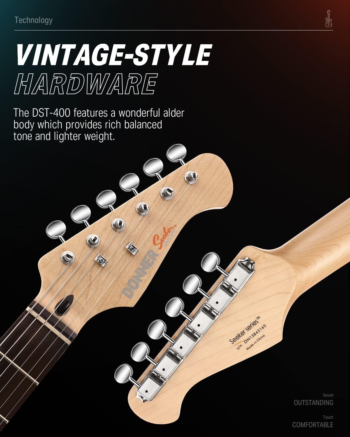 Berdasarkan pengalaman kreatif & produktif selama bertahun-tahun, gitar elektrik Donner DST-400 adalah kreasi yang diciptakan oleh Donner untuk para gitaris atau yang sedang belajar gitar. Dilengkapi dengan kabel gitar bahan Oxygen-free-copper-center conductor 10-ft AWG24 untuk penghubung ke amplifier dan tas gitar elektrik 600-D yang terbuat dari kain nilon oxford tahan air. Merupakan pilihan ideal bagi anda untuk menggunakan gitar elektrik ini sebagai perlengkapan instrumen musik dengan atribut profesional.