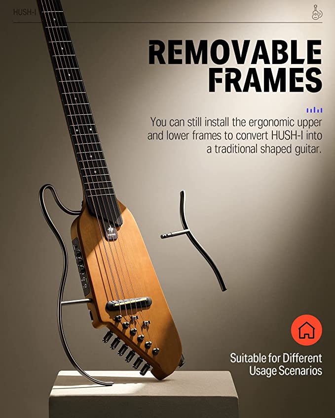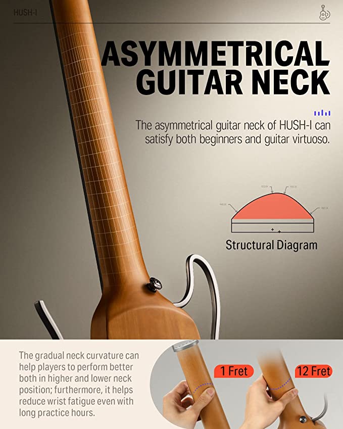 - [Buat Latihan Lebih Nyaman] Gitar headless (tanpa kepala) HUSH memiliki neck gitar asimetris, yang membantu pemain tampil lebih baik di posisi neck atas dan bawah sambil mengurangi kelelahan pergelangan tangan selama sesi latihan yang panjang. Fret bulat khusus HUSH-I cocok untuk pemula dan membantu mencegah cedera jari selama latihan.
