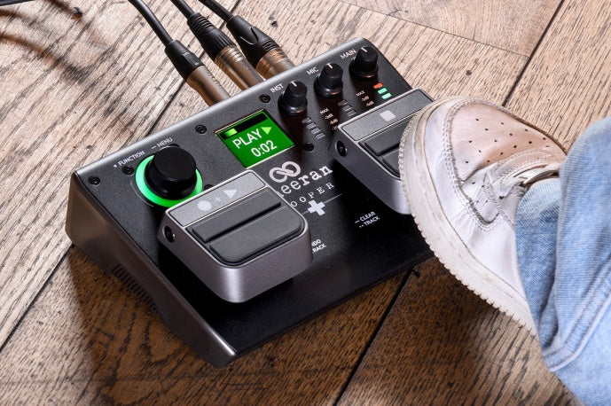 Featuring intuitive looper modes, premium die-cast aluminium pedals, full color display, LED loop ring, microphone and instrument inputs, 3 hours of internal loop storage, plus over 6 hours of battery life and more!