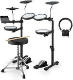 Termasuk 4 x 6 drum set elektronik mesh head, 3 x 8 rubber simbal pad dengan full strike zone, rak metal yang kokoh, modul suara drum, kursi drum, stik drum, headphone, dan kabel, semua yang Anda butuhkan agar anak-anak dapat menikmati asyiknya bermain drum.