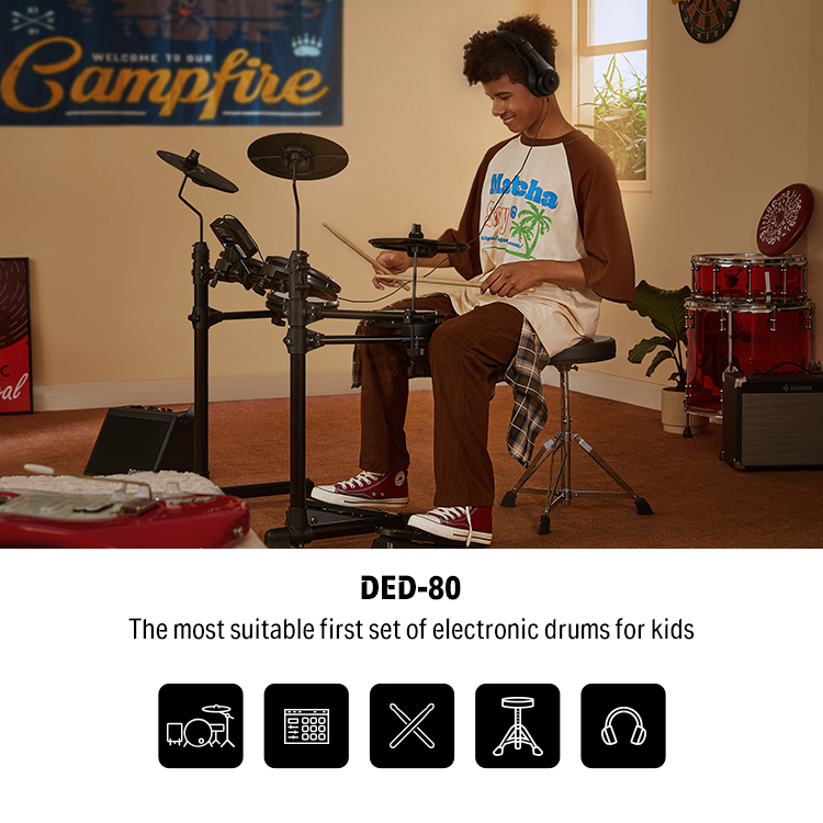 Drum set elektronik Donner DED-80 menggunakan teknologi kejernihan dinamis yang cerdas untuk menghasilkan suara yang realistis dan permainan yang menyenangkan. Ini menampilkan 180 pilihan suara, 15 drum kit, dan 30 lagu demo, mencakup berbagai genre musik.