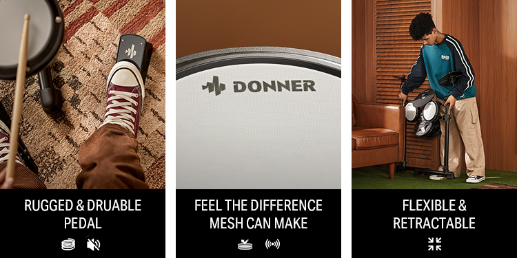 Donner telah mengembangkan pedal struktur baru yang nyaman dan tahan lama. Desain pedal yang ringan mengurangi sebagian besar kebisingan saat menginjak pedal hi-hat, memberi Anda pengalaman terbaik. Pedal berukuran besar dengan penyangga pegas bawaan mereproduksi logika pengoperasian pedal sungguhan, membantu peserta mengontrol kekuatan mereka dengan lebih baik.