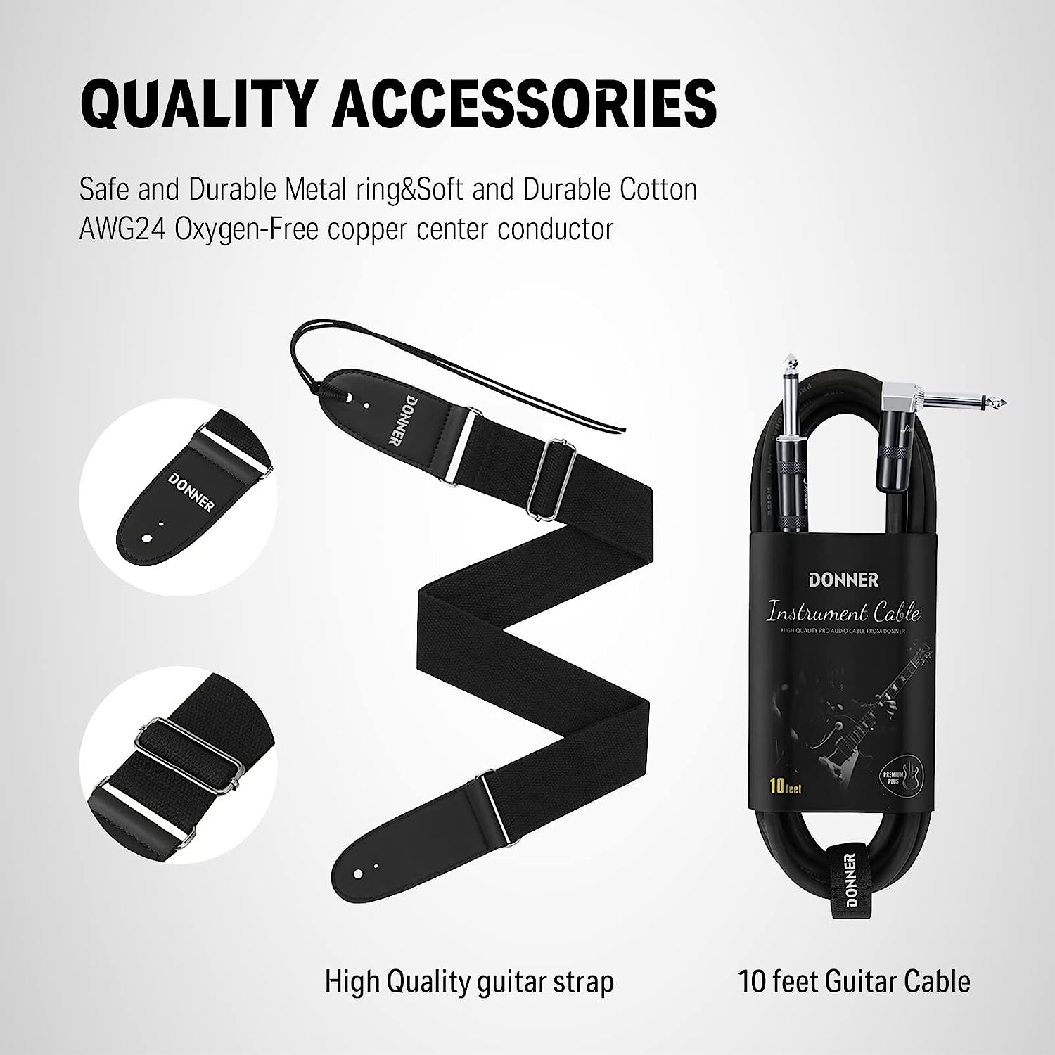 - 22 Fret Copper-nickel Gitar elektrik Donner dilengkapi dengan pickup switch selector, kenop volume, dan dua kenop nada yang berbeda. 22 fret copper-nikel dengan posisi Fret Tanda di neck dan bagian atas fingerboard.