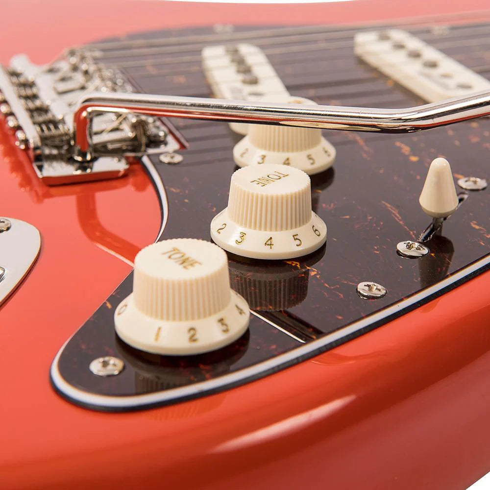 The Vintage ReIssued Series V6MFR combines the very best of time-served aesthetics and forward-thinking design ingenuity. A trio of Wilkinson WVS Alnico V pickups give the guitar the perfect balance between scorching highs, rich mids and plummy low end, just what you'd expect from a guitar of this nature. The Wilkinson vibrato bridge, meanwhile, features an innovative stagger-drilled block which radically improves the guitar's intonation, whilst maintaining incredible return-to-pitch accuracy.