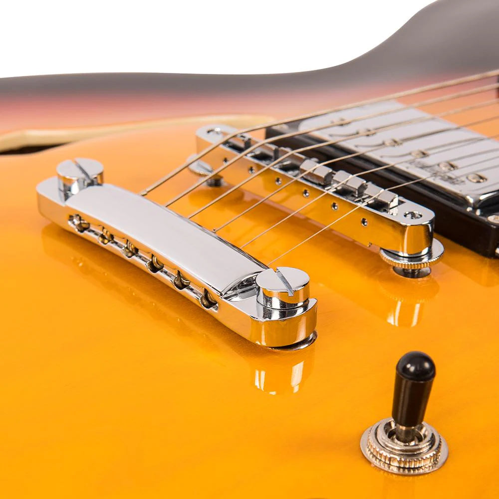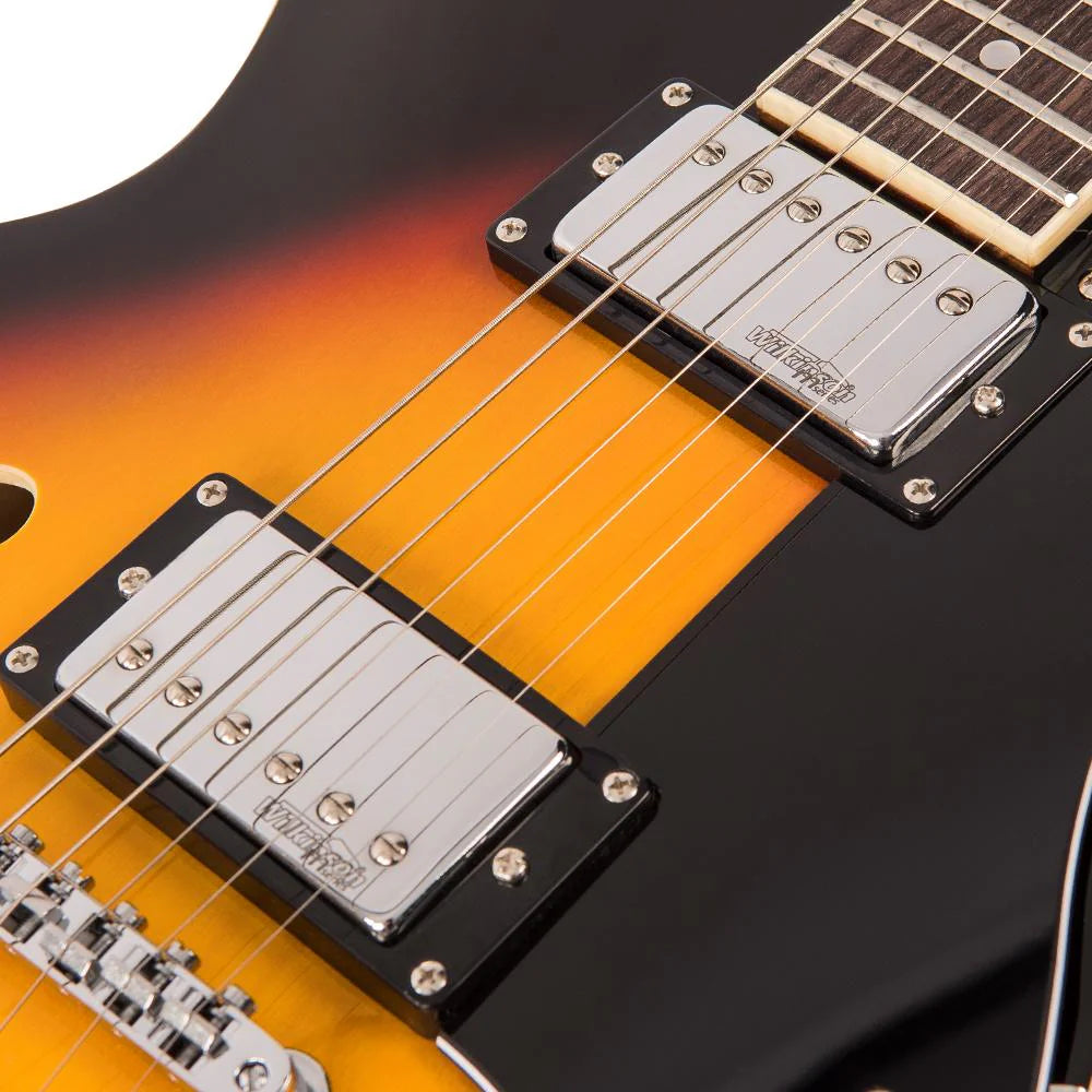 Sporting two WOCHB double coil pickups, the Vintage VSA500 is equally adept when comping smooth jazz accompaniments as it is singing out single note blues lines, while its chambered body carries the sound of strummed chords all the way to the back row and beyond.