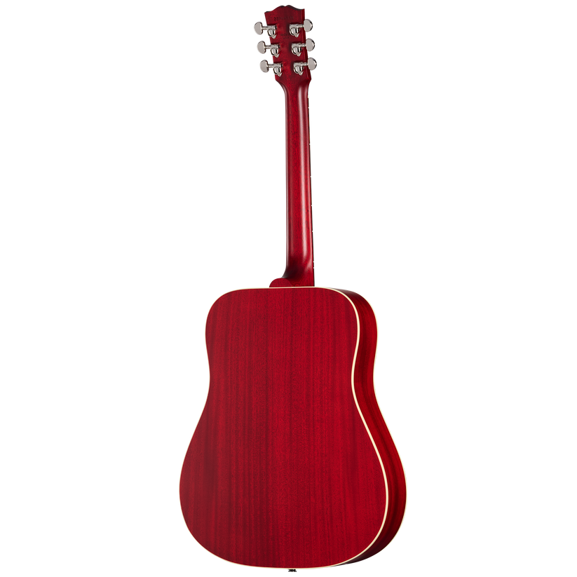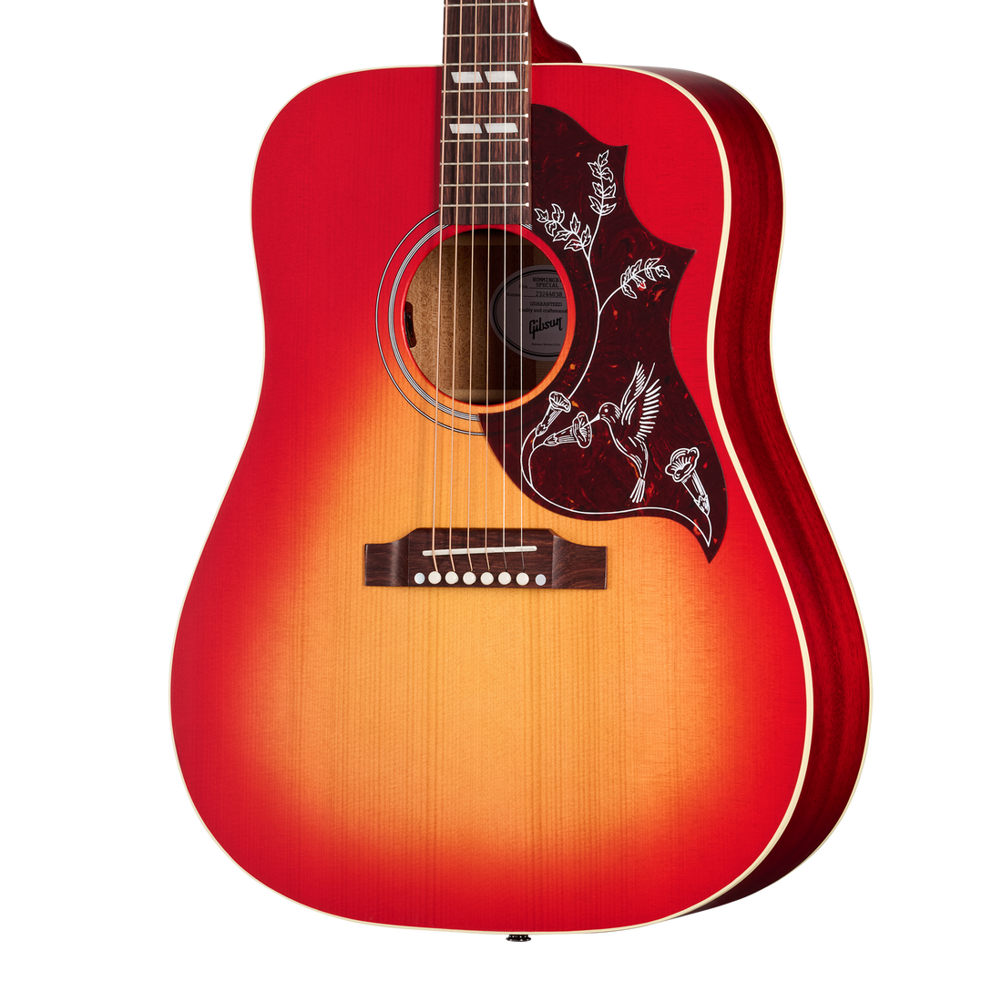 First introduced in 1960, the Gibson Hummingbird™ is one of the most distinctive and well-loved acoustic guitars ever made. Handcrafted with care in Bozeman, Montana, by Gibson’s expert acoustic luthiers, the new Gibson Hummingbird Special offers players a USA-built Gibson Hummingbird model at a very attractive price. The Hummingbird Special has a traditional square-shouldered body constructed using genuine solid mahogany for the back and sides and a solid Sitka spruce top that is reinforced with our traditional scalloped X-bracing. This combination of tonewoods delivers a warm, balanced tone with excellent dynamic range that is perfect for any style of music. The “concert depth” body is slightly thinner than the body on a Hummingbird Standard, giving it a leaner and tighter bass response that sits perfectly in the mix and also makes it easier to hold. The utile neck is attached to the body with a compound dovetail neck-to-body joint, and like all Gibson acoustic guitars, it is affixed with hot hide glue. The neck has a comfortable Round profile, and the rosewood fretboard has a 12” radius and features pearloid parallelogram inlays, which is one of the visual hallmarks that makes the Hummingbird easily recognizable. The fretboard is fitted with 20 standard frets. The traditional belly-up rosewood bridge is equipped with a TUSQ® saddle, and the nut and bridge pins are also TUSQ. High-quality Grover® Rotomatic® tuners ensure rock-solid tuning stability. The pickguard features a simplified version of the world-famous Hummingbird pickguard graphics. The Hummingbird Special is finished in satin nitrocellulose lacquer in your choice of Satin Vintage Cherry Sunburst and Satin Wine Red. It comes equipped with an L.R. Baggs™ Element Bronze under-saddle piezo pickup and active preamp with an easily accessible soundhole-mounted volume control, so it’s stage and studio-ready from the moment you take it out of the included premium soft shell case.