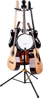 The HERCULES Multi - Guitar Stand GS526B PLUS accommodates six instruments and features the foldable Auto Grip System (AGS) yokes, Instant Height Adjustment Clutch, Specially Formulated Foam (SFF) padding contacts and the adjustable back rests.