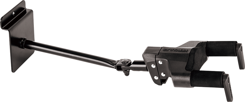 The HERCULES Auto-Swivel/Adjustable Yoke Hanger GSP40SB PLUS rotates to accommodate most guitars and pivots left or right so you can display the instrument facing various directions. It features a slat wall base for display use.