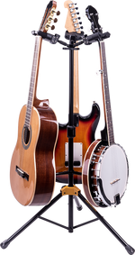 The HERCULES Triple Guitar Stand GS432B PLUS accommodates three instruments and features the foldable Auto Grip System (AGS) yokes, Instant Height Adjustment Clutch, Specially Formulated Foam (SFF) padding contacts and the adjustable back rests.